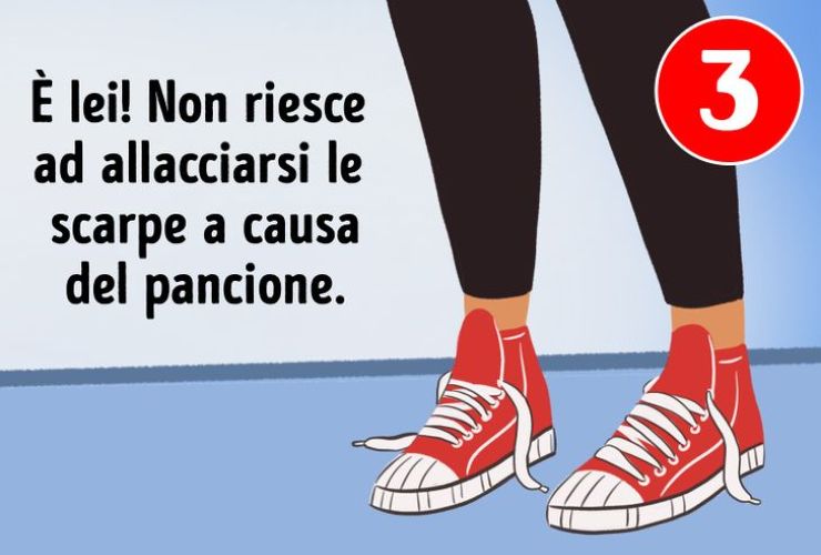 C’è un piccolo dettaglio in una delle tre foto che rivela la soluzione: quale delle tre fanciulle è incinta? Secondo te, è la numero uno? Cioè la donna con le scarpe alte e di colore blu? O la numero 2, cioè la donna con le ballerine viola e senza tacco? Oppure la numero 3? Cioè la fanciulla con un paio di scarpe da ginnastica?