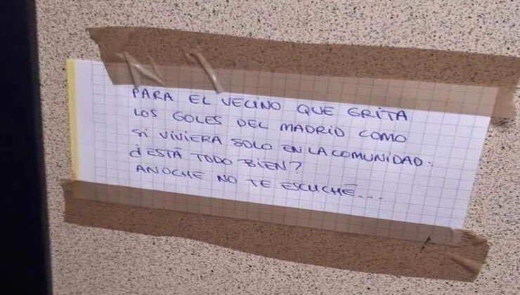 In un post su Twitter, c’è questa foto di un cartello che recita quanto segue: “Per il vicino che grida al gol del Madrid come se vivesse da solo nel condominio. Va tutto bene? Non ti ho sentito ieri sera”.