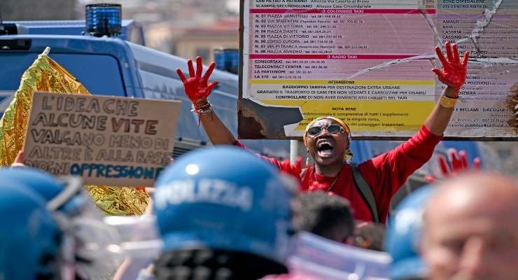 I manifestanti avevano le mani dipinte di rosso e protestavano contro il decreto Cutro. Non sono mancati gli slogan antifascisti e le proteste contro il governo Meloni. L’intento principale era quello di consegnare al ministro Piantedosi una corona di fiori in ricordo dei morti della strage di Cutro e delle altre stragi in mare.