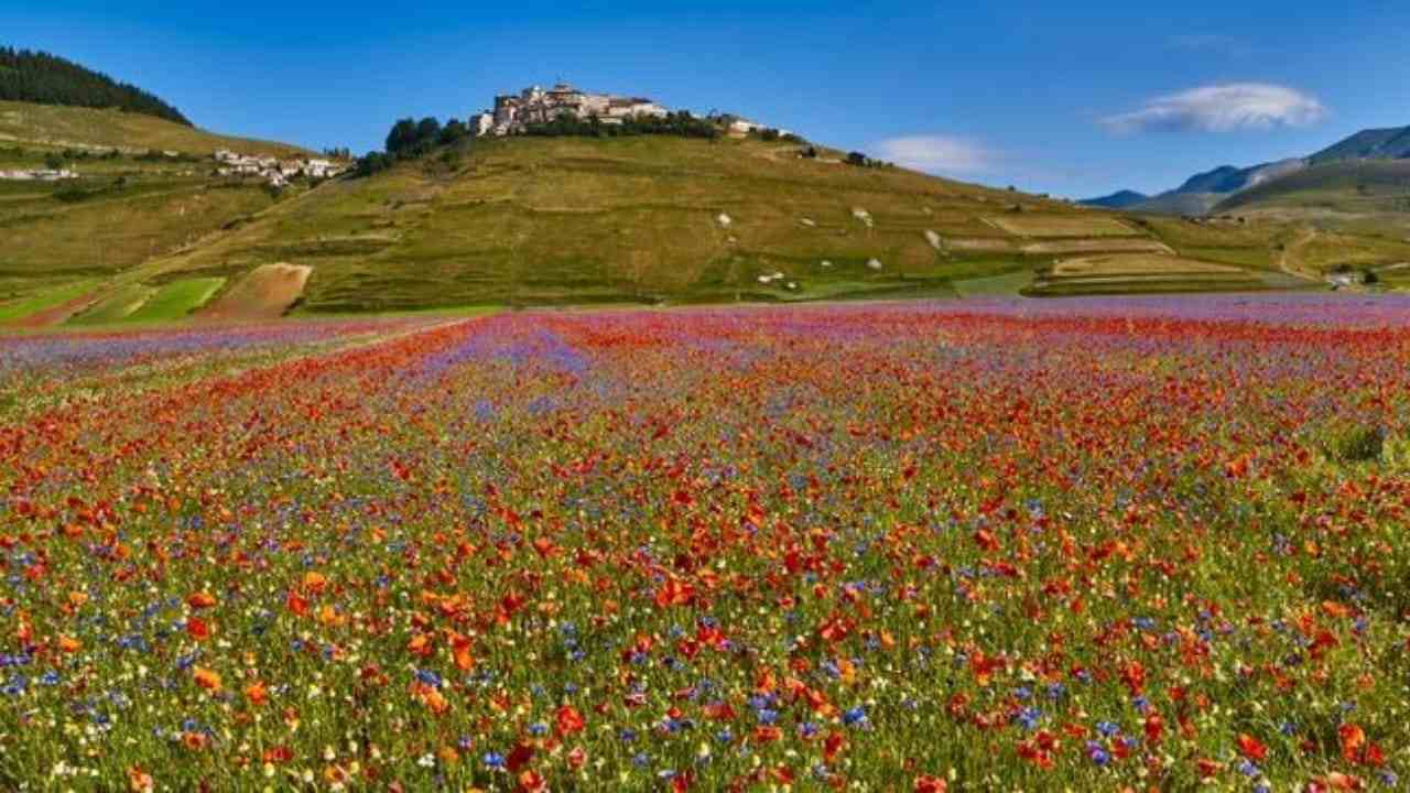 Tra tutte queste meraviglie infinite, una campagna durante la primavera si veste di colori e di fiori. Siamo a Castelluccio di Norcia e qui lo spettacolo è gratuito, offerto da Madre Natura da immortalare come fosse una cartolina unica nel suo genere.
