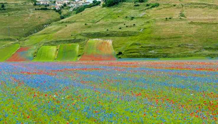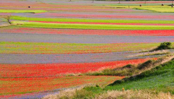 Le tinte sono diverse, dall’azzurro chiaro del fiore della lenticchia sino al rosa e il bianco che lasciano spazio alla senape selvatica con il suo giallo tenue. Poi c’è il papavero che regala una nota di rosso e il viola del fiordaliso: un quadro dipinto con colori vivi che esplodono completamente tra maggio e giugno. Non esistono date certe per godere di questa magia, perché ogni anno i fattori possono essere differenti: in linea generale si parla comunque di metà primavera, sempre verso giugno.