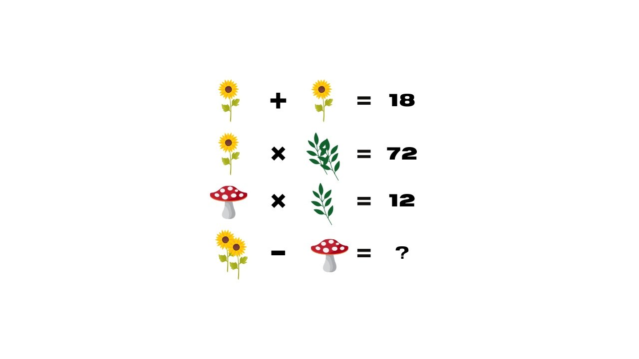 Infine, la quarta ed ultima equazione richiede di individuare il valore di “2 girasoli – fungo“. Grazie alle informazioni che abbiamo ottenuto dalle prime tre equazioni, sappiamo che 2 girasoli fanno 9 x 2 = 18, e che il valore del fungo è 3. Quindi, 2 girasoli meno il fungo dà come risultato 18 – 3 = 15. Perciò, la soluzione finale del rompicapo è 15.