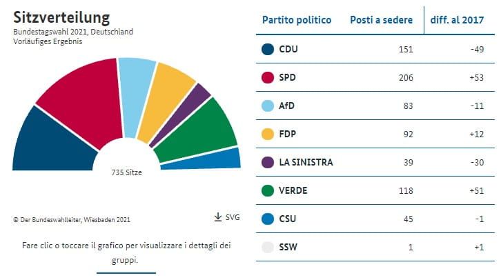 In virtù dei voti ricevuti nessun partito può governare da solo. Sarà necessario formare una coalizione, che poi al Bundestag eleggerà il prossimo cancelliere.
