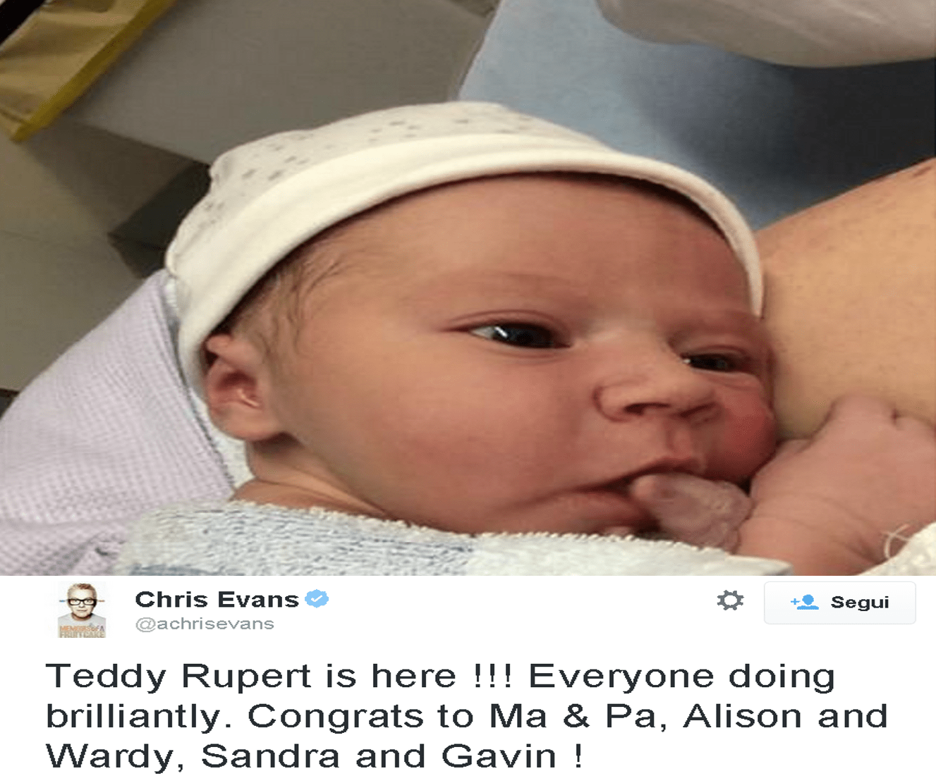Chris Evans nonno per la prima volta: il presentatore inglese accoglie il piccolo Teddy