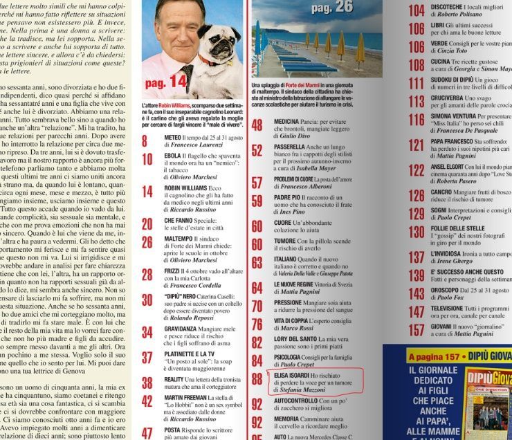 Sul magazine dell’agosto 2014 la Isoardi appare in copertina e il titolo è il seguente: ‘La conduttrice racconta lo spavento per essere stata operata d’urgenza’. Sfogliando la rivista all’interni, sul sommario si legge: ‘Elisa Isoardi: ‘Ho rischiato di perdere le corde vocali per un tumore”. In effetti anche all’epoca il colloquio era stato rilanciato da molti quotidiani e siti e anche nel 2014 si possono leggere espressioni del tipo: ‘massa tumorale poi risultata benigna’; ‘scoperta di un tumore, un grosso polipo’.