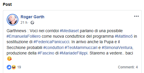 ‘Garthnews : Voci nei corridoi Mediaset parlano di una possibile Emanuela Folliero come nuova conduttrice del programma Mattino5 in sostituzione di #FedericaPanicucci. In arrivo anche la Pupa e il Secchione probabili #conduttori TeoMammuccari e Simona Ventura, produzione della #Fascino di Maria De Filippi. Staremo a vedere… baci’, scrive l’opinionista su Facebook.