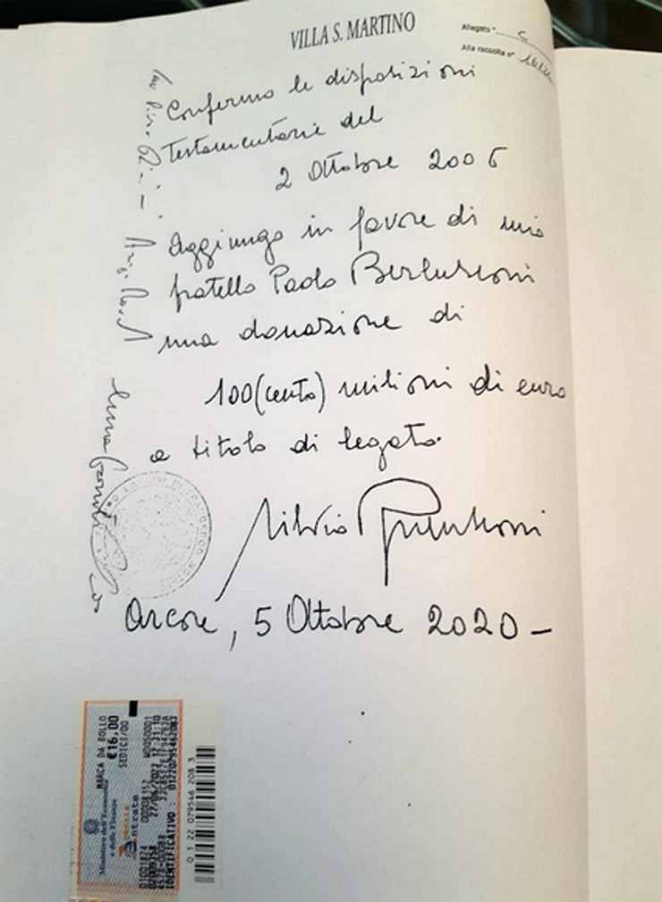 La lettera, redatta su carta intestata “Villa S.Martino”, vede anche la firma di due testimoni, uno dei quali è proprio l’ultima compagna, e procede così: “Dalle vostre eredità di tutti i miei beni dovreste riservare queste donazioni a: 1) Paolo Berlusconi: euro 100 milioni 2) a Marta Fascina: euro 100 milioni 3) a Marcello dell’Utri: euro 30 milioni. Per il bene che gli ho voluto e per quello che loro hanno voluto a me”.