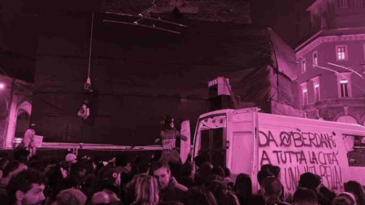 Questa manifestazione però è stata caratterizzata da un episodio abbastanza inquietante, ovvero l’impiccagione di un manichino che raffigurava la Meloni. Appeso per i piedi e sospeso a testa in giù, il pupazzo ha penzolato durante tutta la manifestazione avvenuta sotto le Due Torri, in Piazza di Porta Ravegnana.