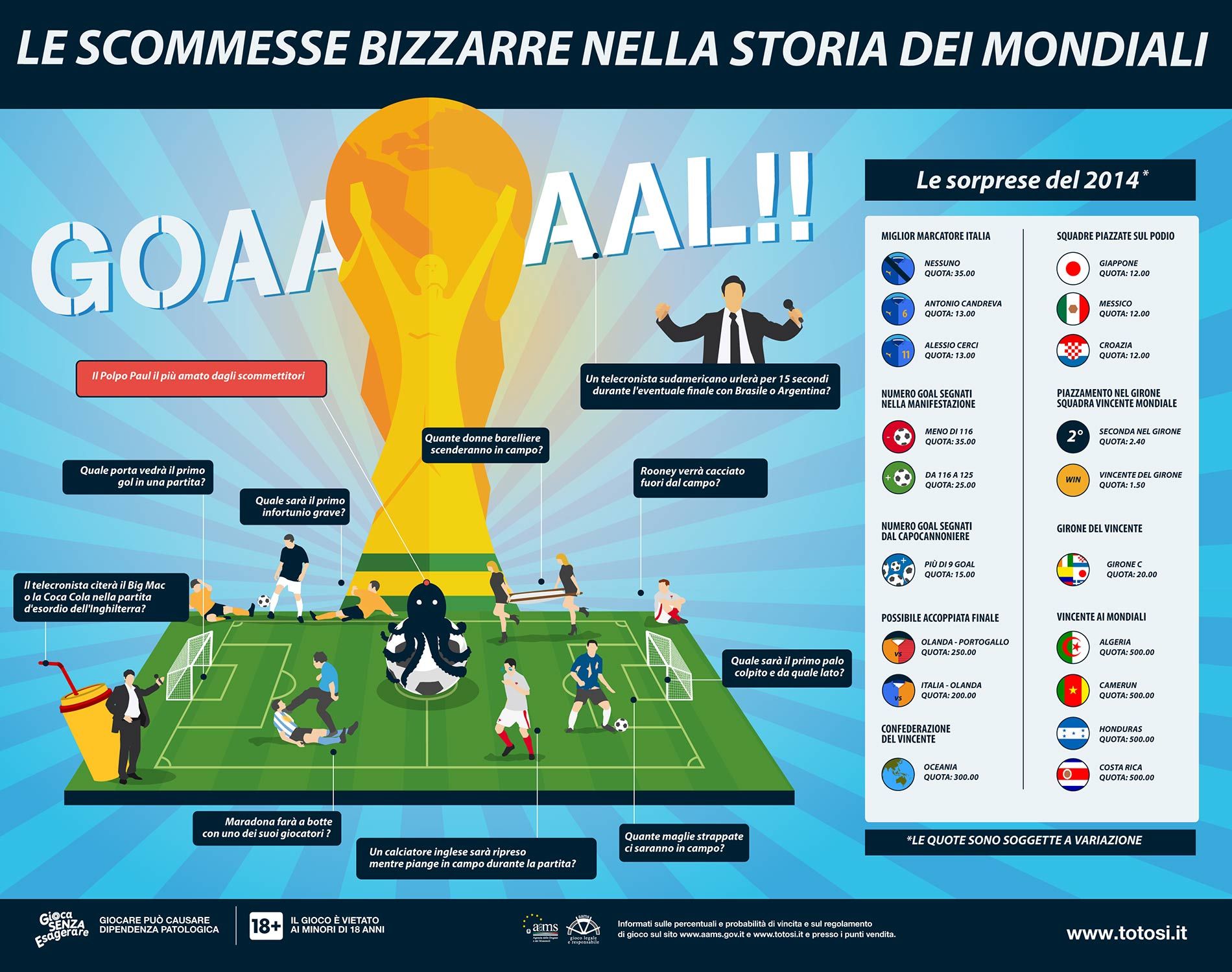 Dite che ha senso scommettere su quante barelliere donna entreranno in campo durante una partita? Quale sarà il primo palo colpito? Ma, soprattutto, il commentatore citerà per prima la parola Big Mac o Coca Cola? Questi sono solo alcuni esempi delle puntate più pazze ed impensabili. Oppure si può rischiare su squadre improbabili. Le quote delle nazionali, come è normale che sia, stanno variando a seconda dei risultati ottenuti in questi primi giorni. All’esordio il Giappone, la Croazia e il Messico hanno faticato. Quindi la quota che una di queste nazionali arrivi sul podio si è alzata 12 volte la posta giocata. Quindi su chi vale la pena rischiare? Sicuramente l’Algeria o l’Iran vincente al Mondiale (quota di 500 volte la posta) sono delle puntate che probabilmente sono impensabili e fuori dalla logica del calcio. Ma in questo sport, si sà, nulla è scontato e quindi perché non credere in queste due piccole squadre? Alla fine in molti hanno creduto nel bis mondiale della Spagna e invece le Furie Rosse hanno già abbandonato la competizione. Nelle scommesse, come nel calcio, qualsiasi risultato è possibile. Si può puntare anche sui marcatori e, secondo i bookmakers, per quanto riguarda la nazionale italiana, Antonio Candreva e Alessio Cerci non sono tra i favoriti per diventare i migliori marcatori italiani (quota 13.00). Perché non provarci?