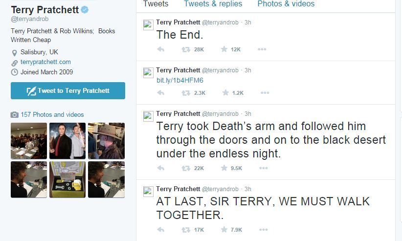 Secondo le prime notizie diffuse dalla Transworld Publishers, ‘lo scrittore è morto nella sua casa con il gatto che dormiva sul letto e circondato dalla sua famiglia. Nei suoi oltre settanta libri, Terry ha arricchito il pianeta come pochi altri prima di lui, e come sanno tutti i suoi lettori, Discworld era il suo modo per fare della satira su questo mondo: Terry – aggiunge la nota stampa – ha affrontato l’Alzheimer (quella seccatura, come la chiamava lui) pubblicamente e coraggiosamente, anche grazie alla scrittura, e la sua eredità durerà nei secoli a venire‘. Oltre a continuare a scrivere di opere fantasy, la malattia aveva reso impegnato Pratchett anche ‘socialmente’, sostenendo campagne per introdurre la possibilità di suicidio assistito per i malati terminali.